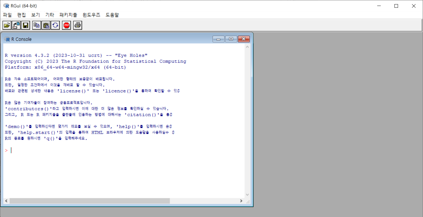 https://www.r-project.org/ -> CRAN -> 미러사이트 -> Download R for Windows -> base -> Download R-4.3.2 for Windows -> 실행