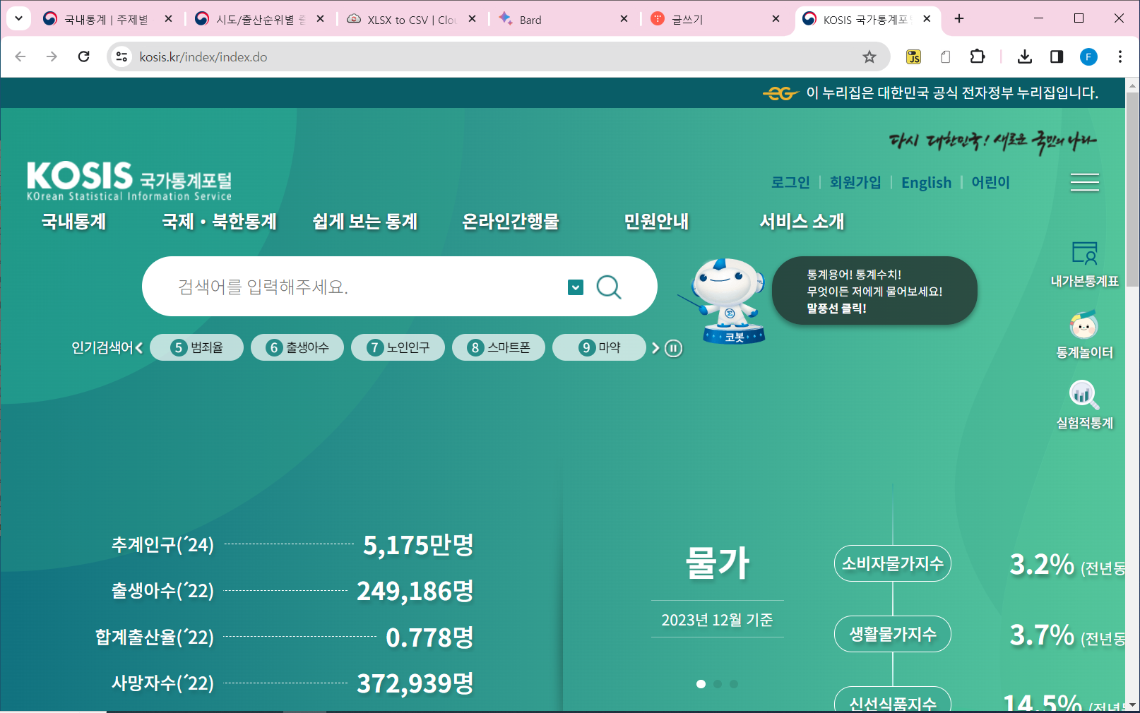 국가통계정보(통계청 Kosis 정보시스템): https://kosis.kr/index/index.do