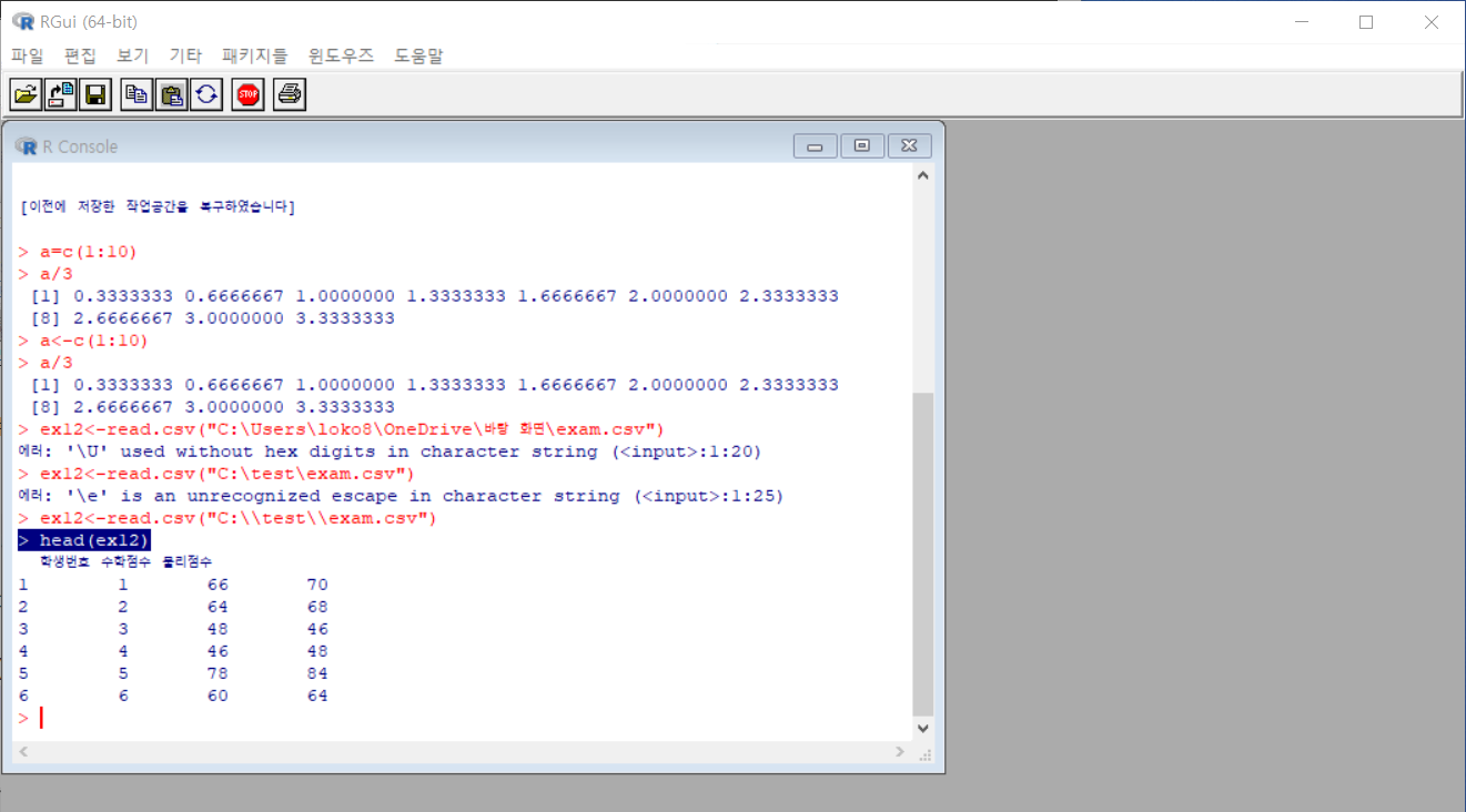 > ex12<-read.csv("C:\\test\\exam.csv")