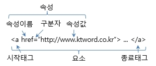 - 속성(attriute): 시작태그에만 사용, 추가적인 정보를 제공하여 명령을 구체화 속성명="속성값"의 형태로 기술, 여러 개의 속성이 있는 경우 공백으로 구분